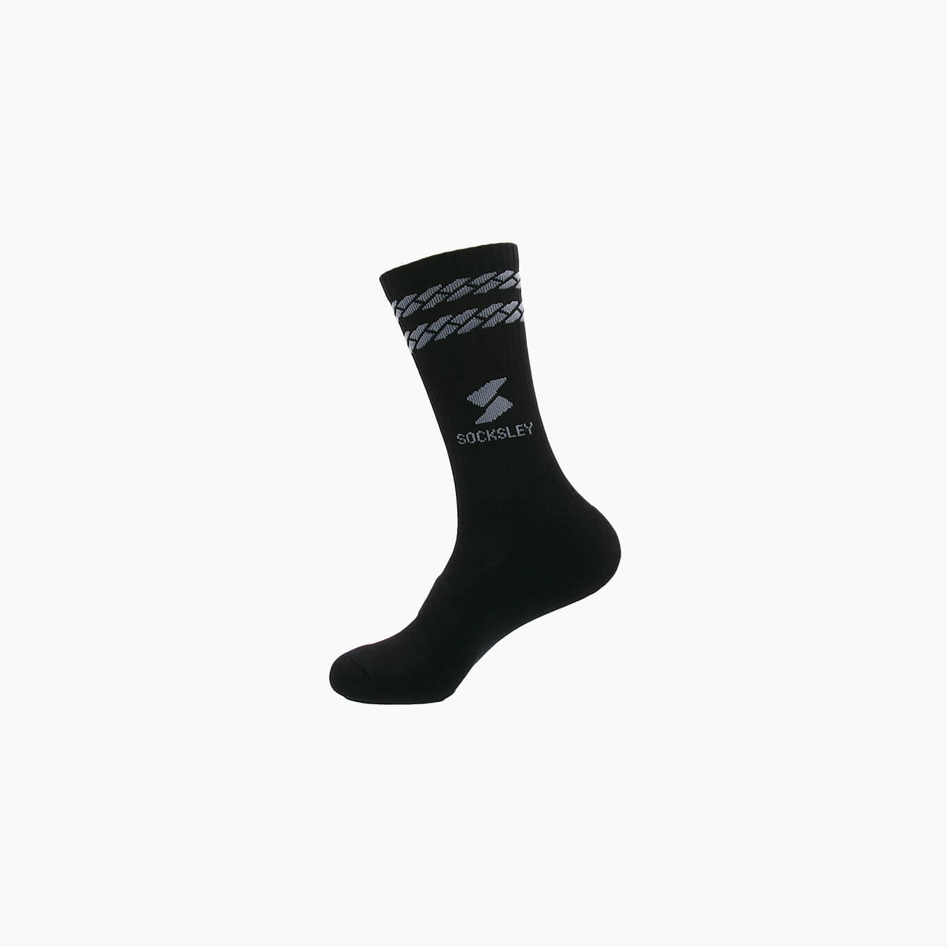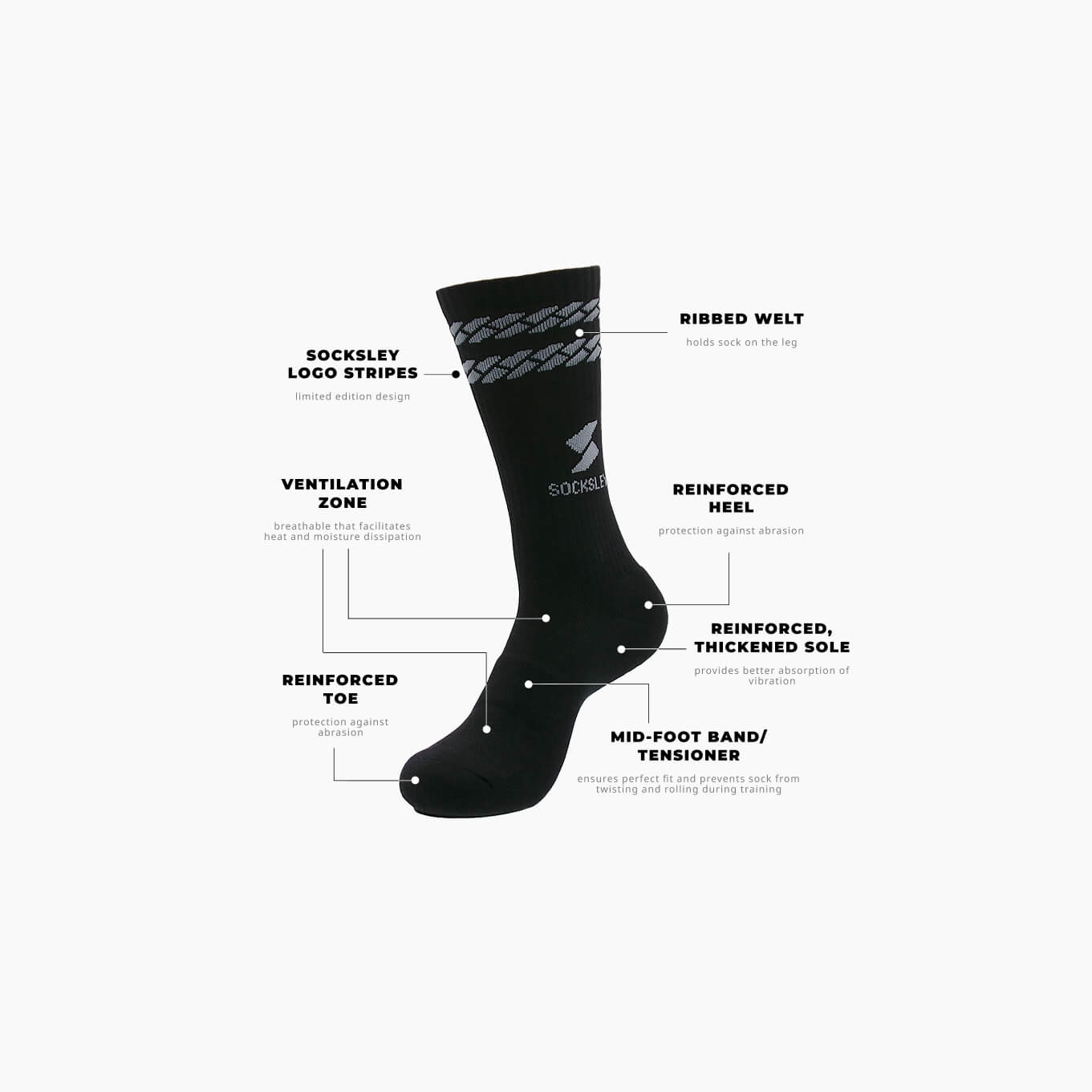 Achieve peak performance with the SOCKSLEY limited edition gray stripes on black premium multi-sport athletics crew socks, tailored for comfort in demanding sports like trail running and cycling throughout Europe. Featuring robust construction and ventilation, these high-end socks provide the stability and cushioning needed for intense sessions, all while offering a sophisticated look for casual wear.