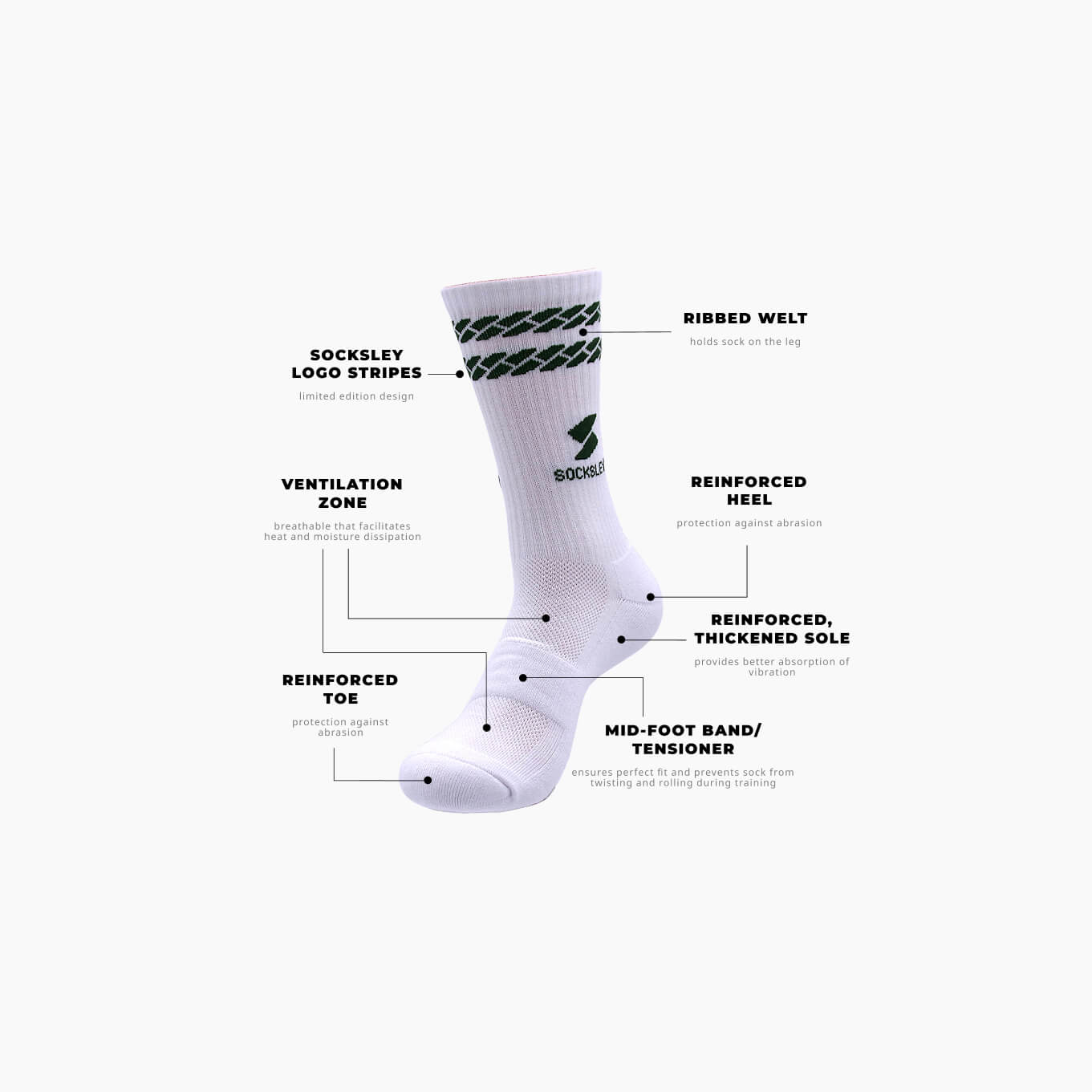 Elevate your active lifestyle with the SOCKSLEY limited edition premium multisport athletic crew socks in forest green stripes on white, designed for ultimate performance and all-day comfort. Ideal for runners, cyclists, and hikers navigating Europe’s varied landscapes, these high-quality sports socks blend style and functionality to keep you moving without compromise. Whether you’re training for a marathon or enjoying a casual walk, these breathable crew socks offer superior support and durability, making them a top choice for athletic enthusiasts seeking reliable footwear accessories.